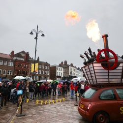 Across the afternoon, six large-scale kinetic structures, mounted on customised Nissan Micras, brought to life key inventions from the past two centuries through performance, music, sound, and engineering. At dusk, the locomotive came alive; powered by “coal of the future” made by 900 local primary school children, and led a magical procession to the Hopetown museum.
